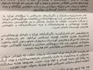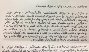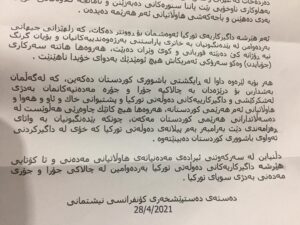 لەگردبونەوەکەی ٢٨/٤/٢٠٢١ هەڵسوڕاوانی سیاسی ومەدەنی لەشاری سلێمانی لەدژی هێرشی سوپای دەوڵەتی تورکیا بۆ سەر خاکی کوردستان-عێراق دا کۆنگریەکی ڕۆژنامەنووسیان ئەنجامدا و بەیاننامەیەکیان لەژێر ناوی دەستەی دەستپێشخەری کۆنفرانسی نیشتمانی بڵاوکردەوە،لەو بەیاننامەیەدا هاتووە کە ئەم دەستدرێژێیەی سەربازی وداگیرکارییەی دەسەڵاتی نامرڤانەی دەوڵەتی تورکیایە و ئەم هێرش و داگیرکارییە مەحکوم دەکەن.