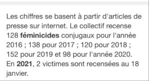 بەپێی سەرچاوەی زانیاریی یەکان لەوڵاتی فەرەنسا لەساڵی ٢٠١٥ هەتا ساڵی ٢٠٢١ بەژمارە ٨٢١ ژن کوژراون ،