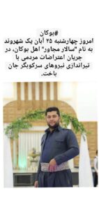 سالار موجاور خەڵکی بۆکان، ئێوارەی ڕۆژی چوارشەممە، ٢۵ی خەزەڵوەری ٢٧٢٢، لە گەڕەکی میراوا و بە تەقەی ڕاستەوخۆی هێزە سەرکوتکەرە حکومەتییەکان سەری کراوەتە ئامانج و لە ئاکامدا گیانی لەدەست دا.