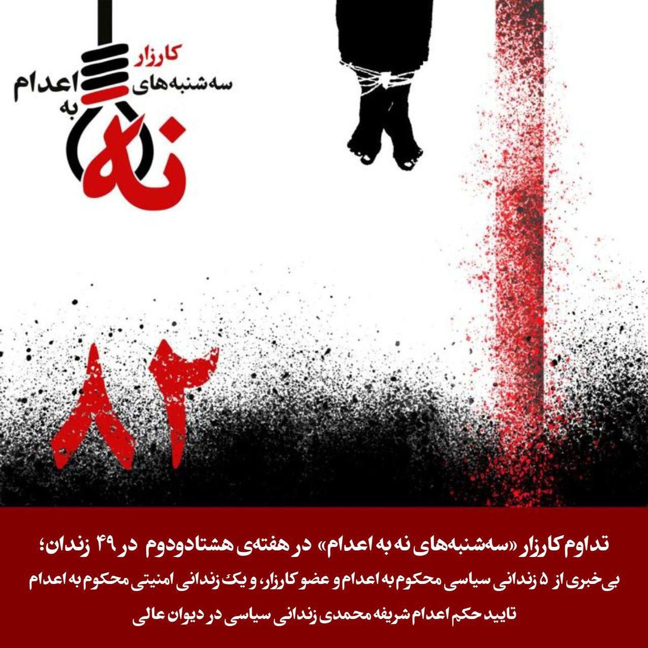کارزار «سهشنبههای نه به اعدام» در هشتاد و دومین هفته خود، بار دیگر صدای اعتراض زندانیان و خانوادههای آنان را به گوش جامعه میرساند. استمرار بیخبری از ۵ زندانی سیاسی محکوم به اعدام و عضو کارزار سهشنبههای نه به اعدام (وحید بنی عامریان، پویا قبادی، بابک علی پور، محمد تقوی، اکبر (شاهرخ) دانشورکار) و یک زندانی امنیتی محکوم به اعدام بابک شهبازی، نشانهای آشکار از نقض فاحش حقوق بشر و فشارهای فزاینده بر جان زندانیان است.