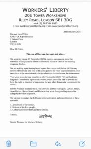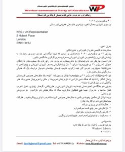 ڕێکخراوی ئازادی کرێکاران )AWL )لەنامەیەکی ناڕەزایەتیدا کە ئاڕاستەی نوینەرایەتی حکومەتی هەرێمیکوردستانکراوە لە لەندەن داوا دەکرێت پهیوهندی بكهن به حكومهتی ههرێمی كوردستانهوه و داوای ڕوونكردنهوه و هاوكات جێبهجێكردنی ئهم داواكاریانه بكهن: